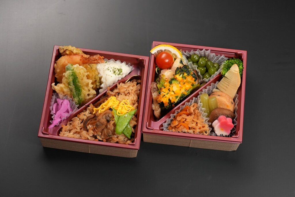 当店人気の「季節の折詰弁当シリーズ」、特選九種の幕の内弁当の春バージョンです。 豚肉の香草パン粉焼き、鶏の菜の花焼き、煮物(がんもどき、たけのこ、ふき、花麩)、鮭のばんけ味噌焼き、蒸し玉子、天ぷら(えび、野菜)、季節の小鉢、香の物、ご飯物には庄内産つや姫ご飯と炊き込みご飯とえびとアサリの佃煮のちらし寿司の三種類を詰め込んだ一折です。 -