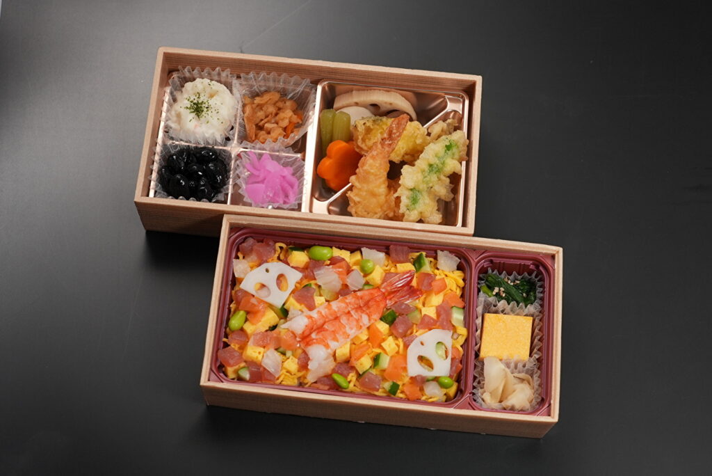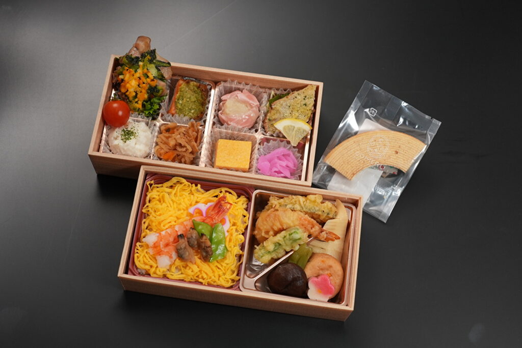 当店人気の「季節の折詰弁当シリーズ」の春バージョンです。 上段は、鶏の葉の花焼き、鮭のばんけ味噌焼き、桜シュウマイ、豚肉の香草パン粉焼き、ポテトサラダ、季節の小鉢、蒸し玉子、香の物。下段には、天ぷら(えび、野菜)、煮物(がんもどき、たけのこ、しいたけ、ふき、花麩)、ご飯物には庄内産つや姫使用の「えびとアサリ佃煮のちらし寿司」を詰め込んだ一折です。スイーツはお米の菓子工房「コメル」さんのカットバウムをお付けします。 -