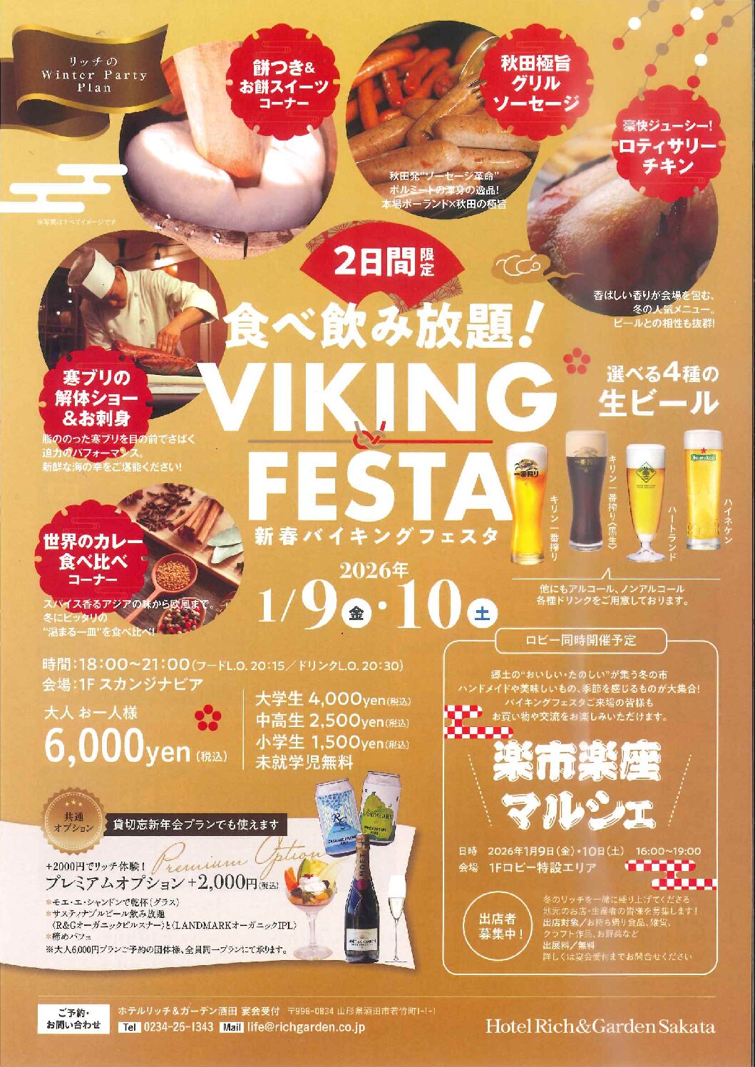 丁度一ヶ月先の2026年1月9(金)、10(土)の両日ホテルリッチ&ガーデン酒田では食べ飲み放題の「新春バイキングフェスタ」を開催します!夏のバイキングフェスタは開催していますが冬の開催は初めてです。餅つき大会、お魚の解体ショー、世界のカレー食べくらべ、ロテサリーチキン、秋田極旨グリルソーセージなどイベントを交えての開催です。お値段は大人6,000円(税込)~小学生1,500円(税込)まで4つのプライスをご準備しています。また、両日会場前での楽市楽座マルシェを開催します、こちらの出店者も募集中です。来年の冬はVFで盛り上がってはいかがでしょうか。