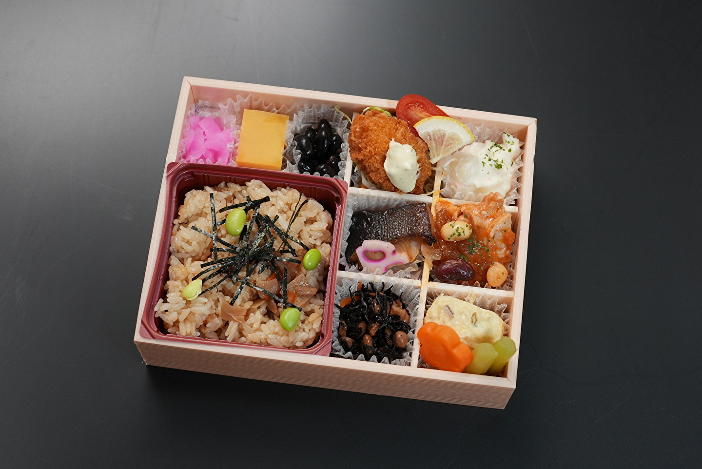 一気に寒くなって来たと思ったら鳥海山に初冠雪があったようです、これから冬に向かって季節は進んでいきますね。冬の新商品の中から「冬の小箱」をご紹介させていただきます。小振りな紙器で人気の「御園小箱」の、冬バージョンです。カキフライ(タルタルソース)、ポテトサラダ、銀鱈の醤油漬け焼き、鶏の豆のトマト煮、季節の小鉢、煮物(がんもどき、ふき、花人参)、蒸し玉子、香の物、黒豆、ご飯物には、庄内産つや姫使用の炊き込みご飯を詰め込んだ一折です。女性中心のお集りや地域のお集りなどに人気のお弁当です。