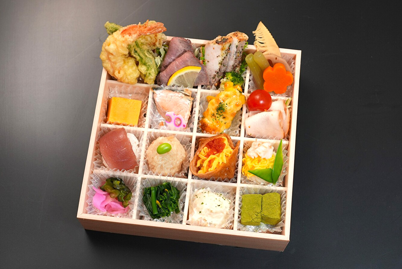 初夏の新商品の中から「十六景初夏の味めぐり」のご案内です。当店人気の「季節の折詰弁当シリーズ」の初夏バージョンです。 天ぷら(海老、野菜)、ローストビーフ、豚肉のバジル焼き、煮物(れんこん、たけのこ、ふき、花人参)、蒸し玉子、マス焼き、アスパラとコーンのすり身寄席チーズ焼き、スモークチキン、漬物二種、季節の小鉢、ポテトサラダ、わらび餅、ご飯物は庄内産つや姫使用の、まぐろの手まり寿司、えびっこと錦糸のいなり寿司、海老と錦糸の手まり寿司、季節の炊き込みご飯の4種類を詰め込みました。彩り豊かな初夏の折詰をお楽しみください。