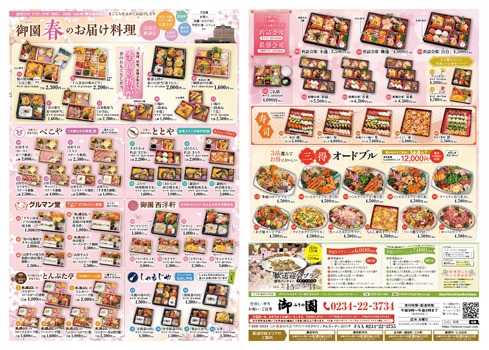 現在は店舗での営業はもとより仕出し、弁当、会席、寿司、オードブルを「宅配料理の御園」として酒田市をはじめ鶴岡市・庄内町・三川町、遊佐町(一部秋田)まで宅配エリアを広げています。