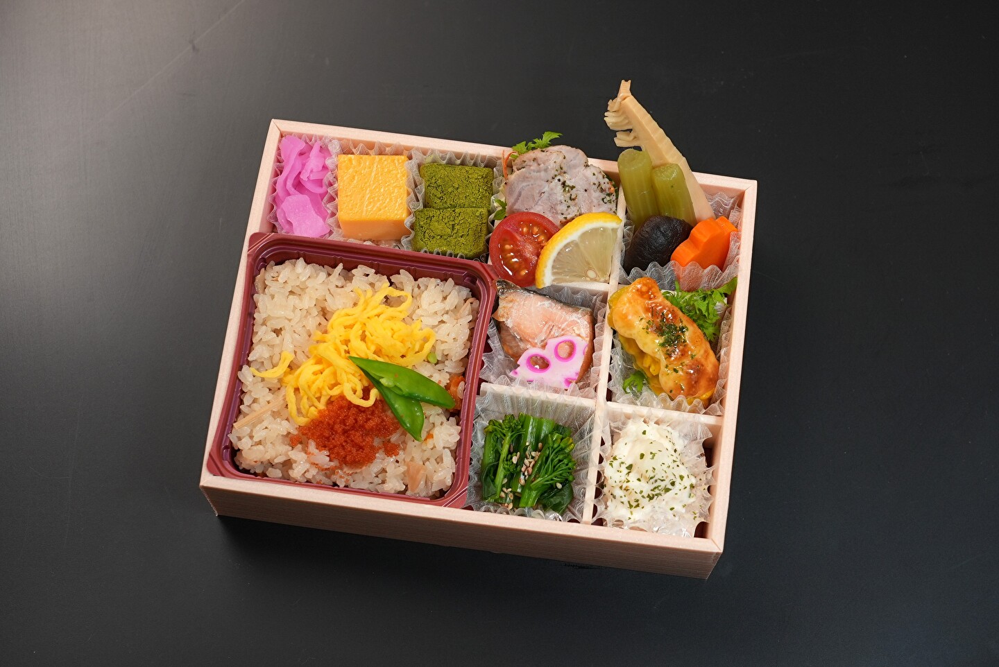 小振りな紙器で人気の「御園小箱」の初夏バージョンです。豚肉のバジル焼き、煮物(たけのこ、しいたけ、ふき、花人参)、マス焼き、アスパラとコーンのすり身チーズ焼き、季節の小鉢、ポテトサラダ、蒸し玉子、漬物、わらび餅、ご飯物には、庄内産つや姫使用の炊き込みご飯錦糸とえびっこ乗せを詰め込んだ一折です。女性中心のお集りや地域のお集りなどに人気のお弁当です。