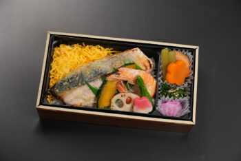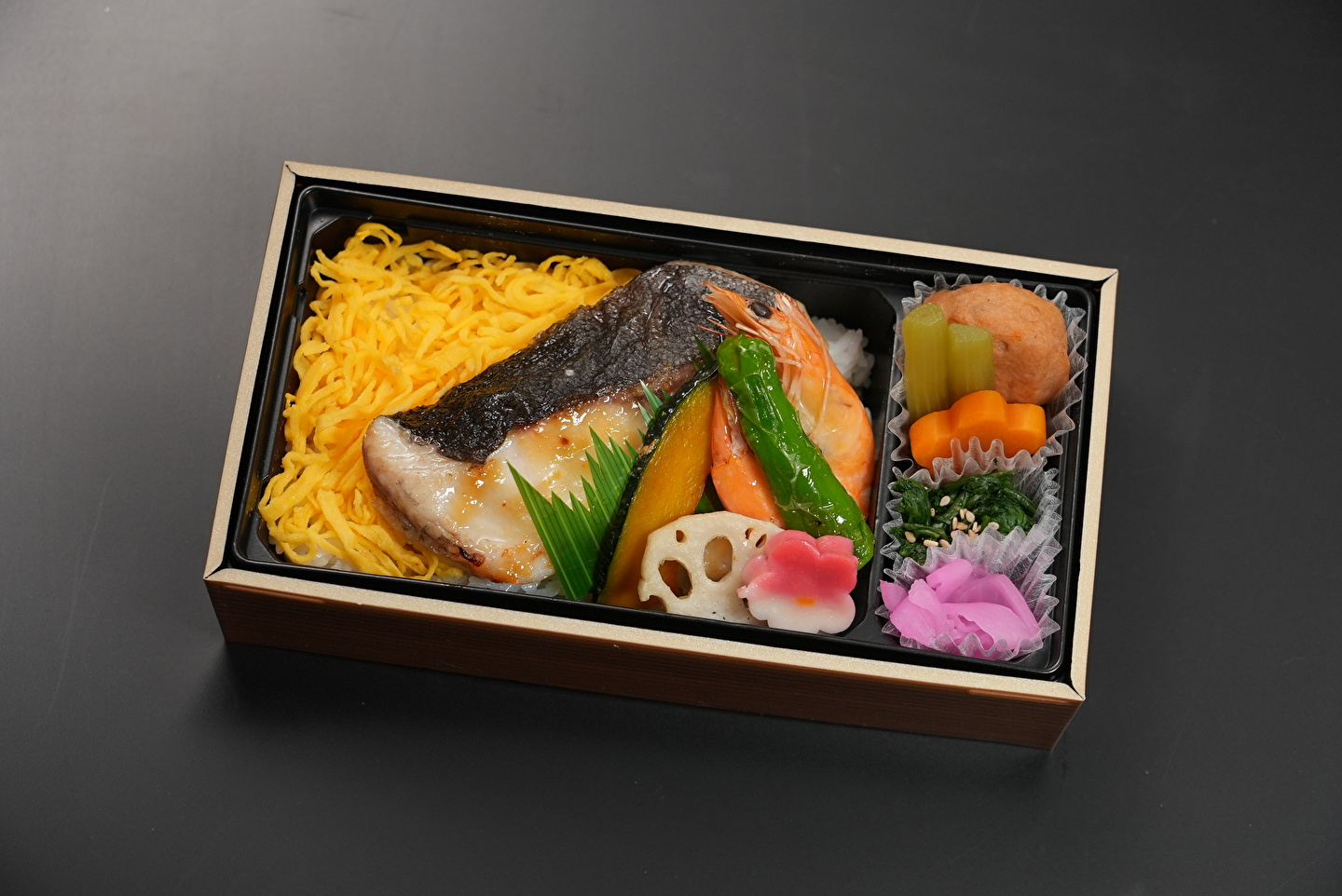 お魚がメインの折詰弁当「ととや」が容器を一新しリニューアルしました! 煮物(がんも、ふき、花人参)、海老の艶煮、季節の小鉢、漬物、野菜の素揚げ、花麩、ご飯は庄内産つや姫、錦糸玉子、自家製銀鱈の西京焼きを詰め込みました。