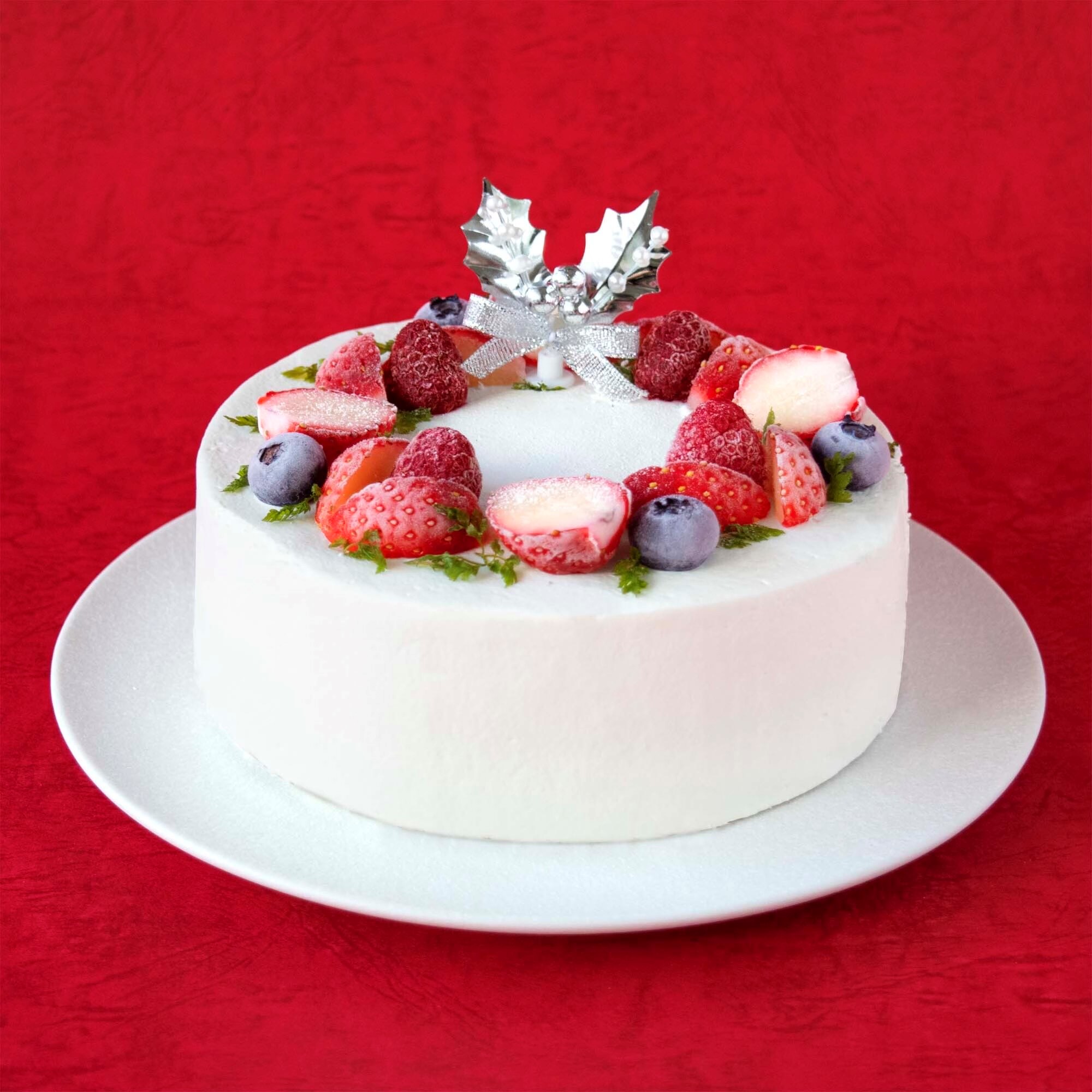山形県庄内産はえぬき米粉を100%使用したふわふわスポンジに北海道産生クリームをたっぷり使い、ベリー類をふんだんにのせたクリスマスケーキです。 いちご、ラズベリー、ブルーベリーを使い、クリスマスリースをイメージしたデコレーションに仕上げました。