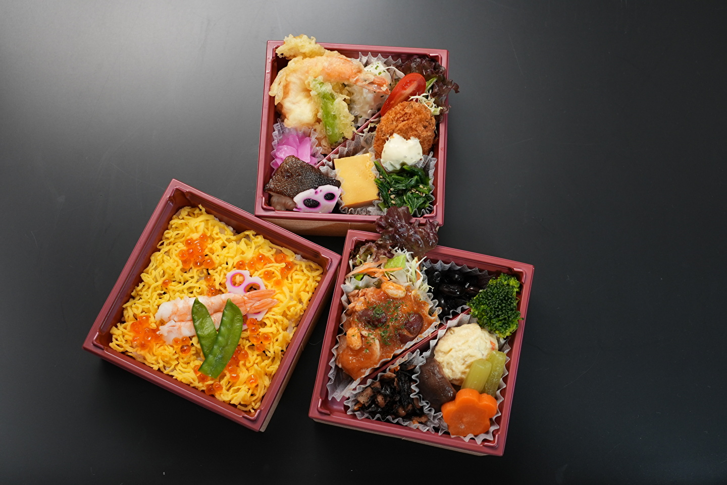 小さな折詰を三段重ねた「口福の重ね」シリーズの冬バージョンです。 壱の重は、天ぷら(えび、野菜)、銀鱈醤油漬け焼き、蒸し玉子、カキフライ(タルタルソース)、季節の小鉢、香の物、ポテトサラダ。 弐の重は、鶏と豆のトマト煮、煮物(がんもどき、しいたけ、ふき、 花にんじん)、季節の小鉢、黒豆。 参の重は、庄名産つや姫使用の「えびといくらのちらし寿司」を詰め込んだ三段重ねの折詰弁当です。 3折以上のご注文で、ちらし寿司をお赤飯に変更できます。ご用途に応じてお選び下さい。 容器サイズ(一段):12㎝×12㎝