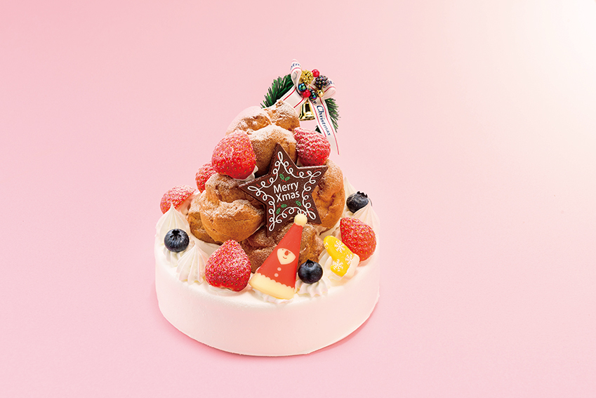 雪山をイメージしてシューを7個重ねました。土台はイチゴをサンドしたスポンジ+生クリーム シューの中にはメイプル風味のカスタードクリームを絞り込んでいます。 商品のお渡しは12月23日~25日になります。